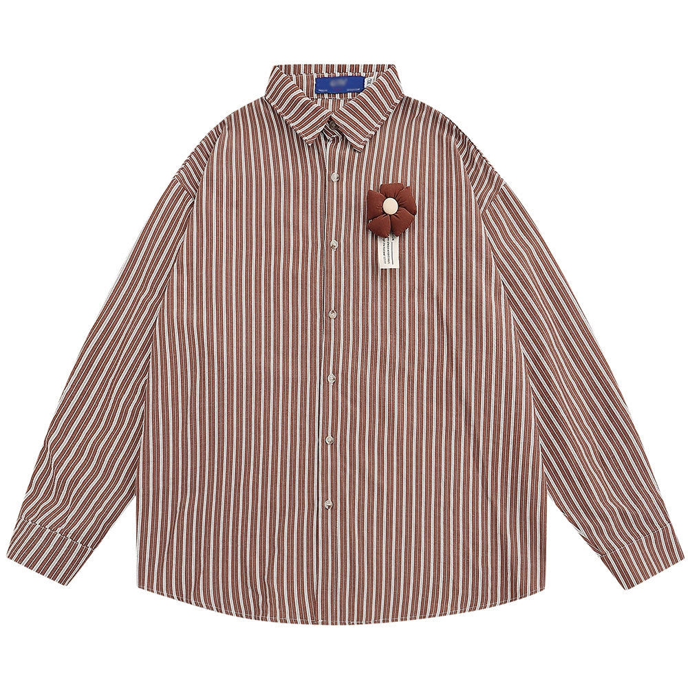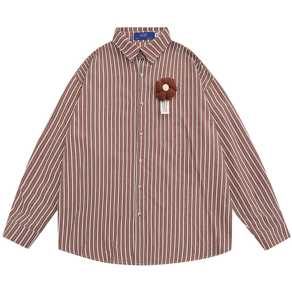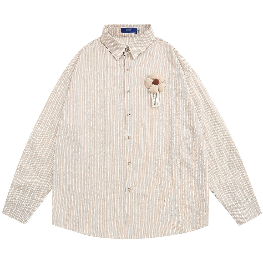 Men Long Sleeved T Shirt Flower Vertical Striped Long Sleeve Shirt Men's Spring and Autumn Loose Shirt Casual