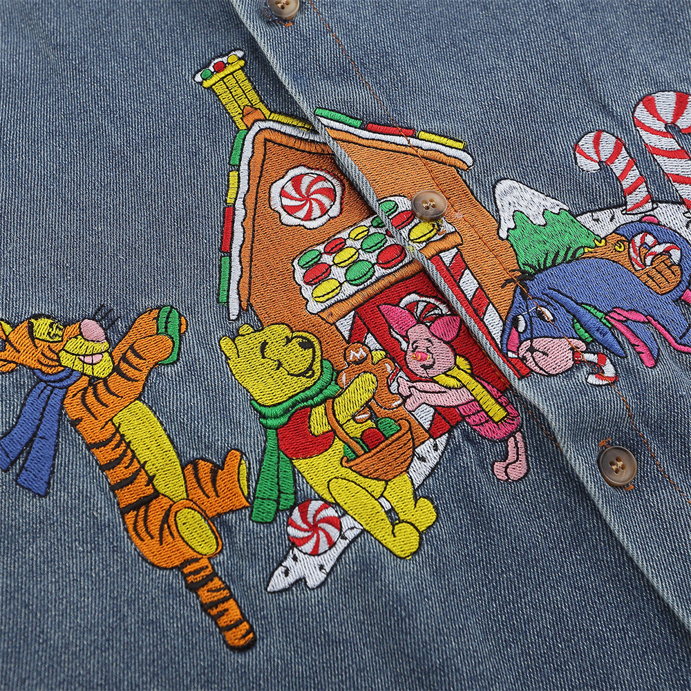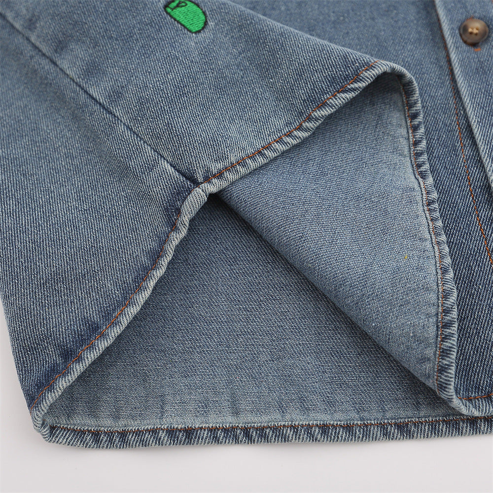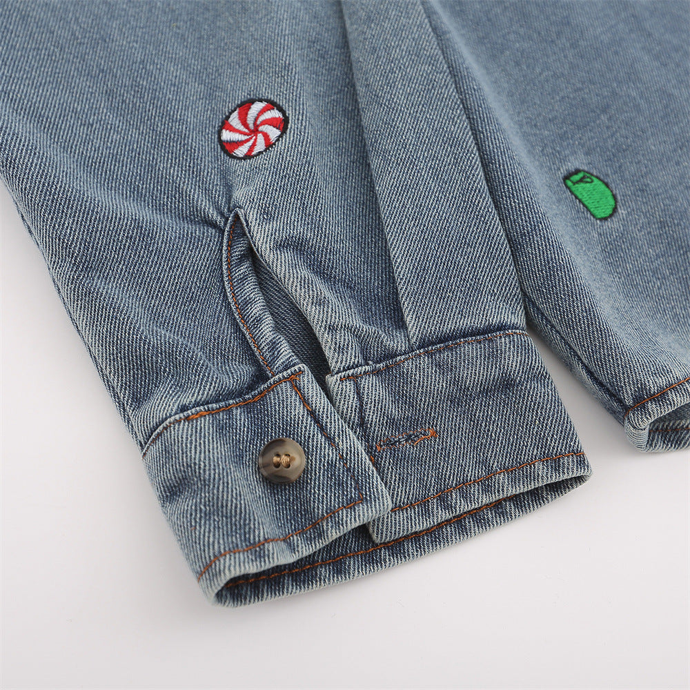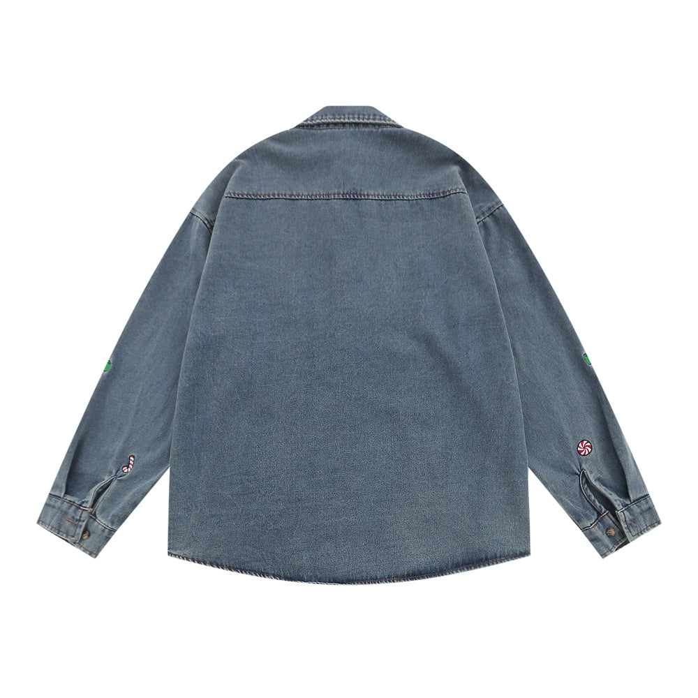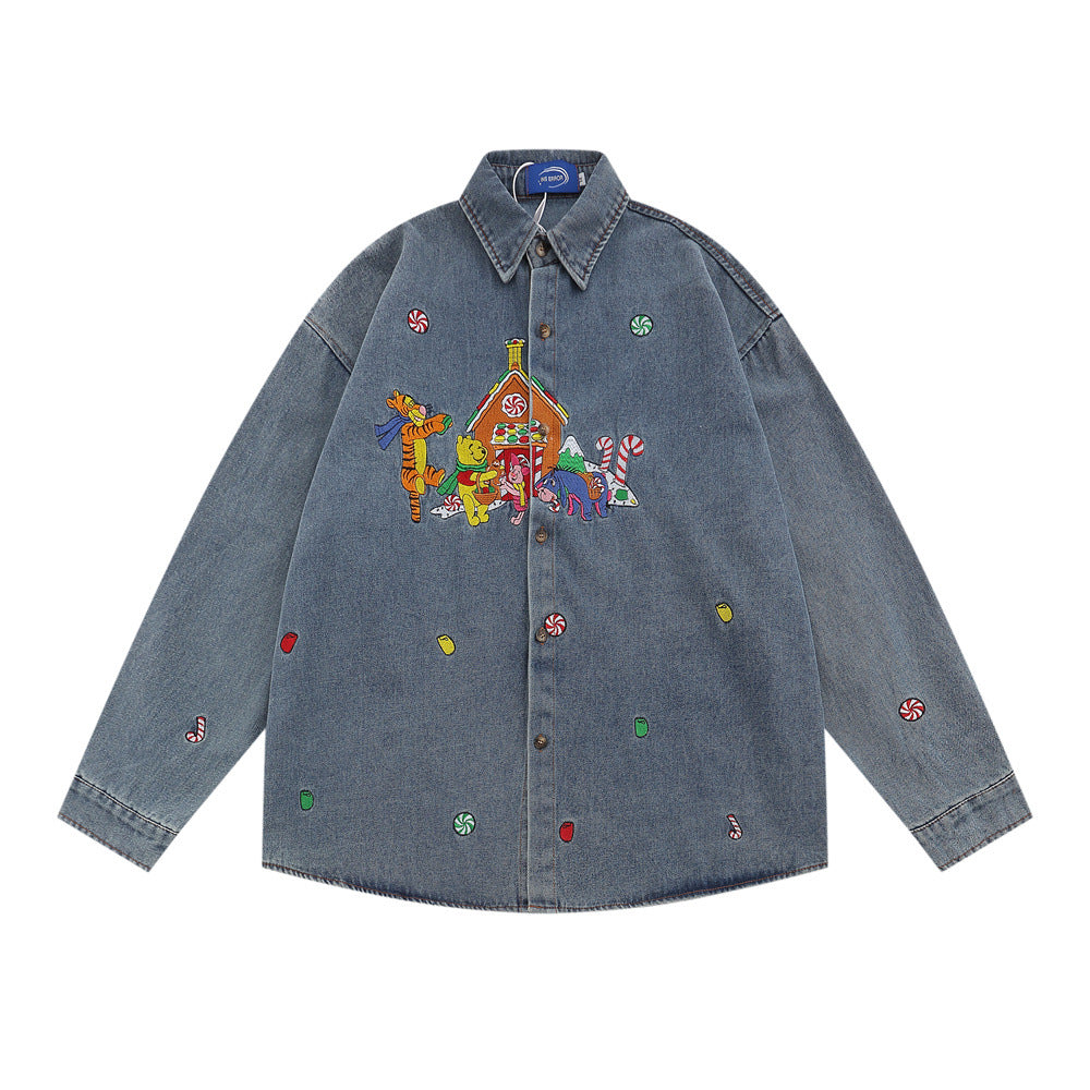 Men Long Sleeved T Shirt Cartoon Embroidered Washed Denim Shirt Coat Spring and Autumn Loose Long Sleeve Shirt