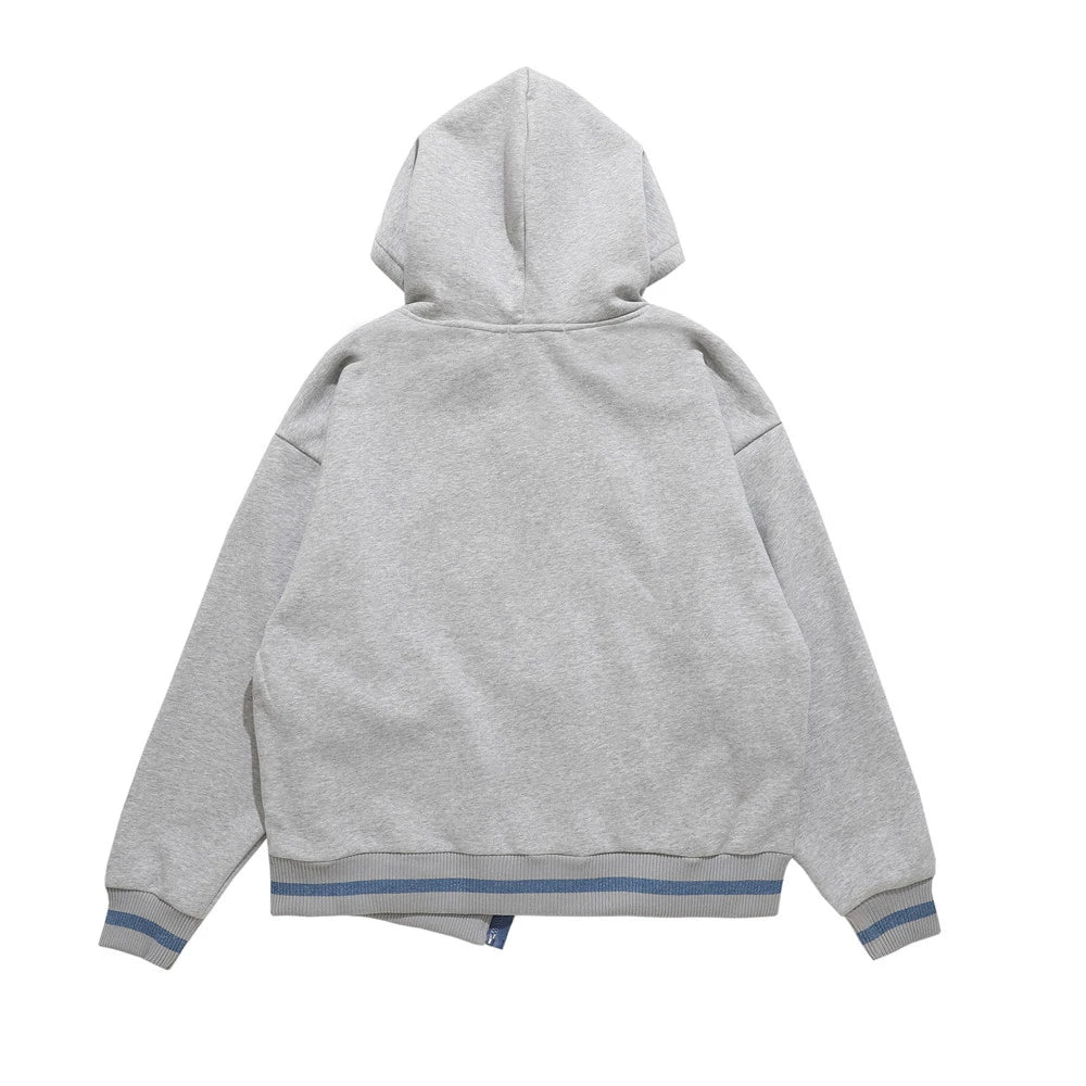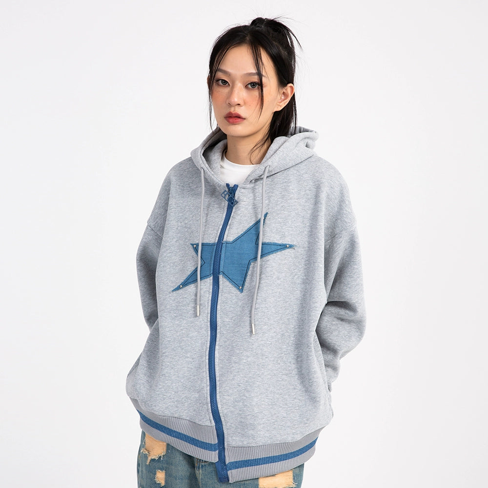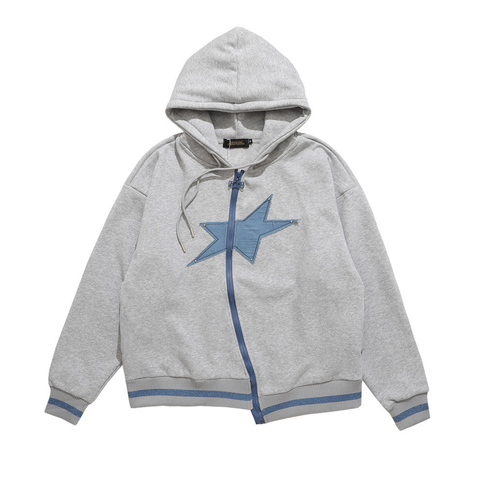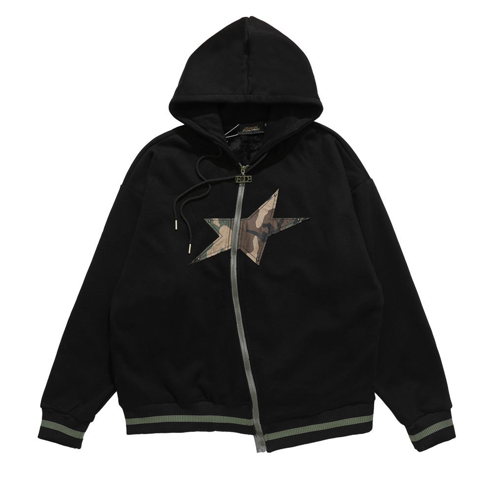 Men Fleece Lined Hoodie Zipper Cardigan Sweater Coat Men's Loose Five-Pointed Star Embroidered Hoodie