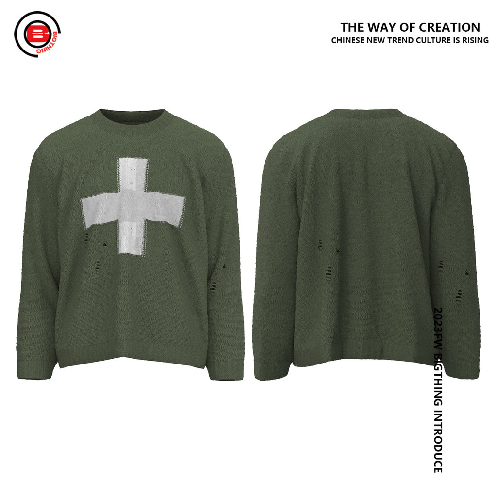 Kapital Sweater Hida Hehong Cross Pattern Ripped round Neck Sweater Pullover Long Sleeve Sweater