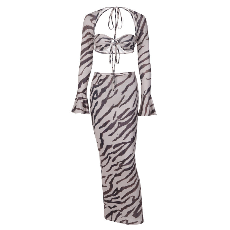 Jungle Print Maxi Dress Sexy Tube Top Long-Sleeve Suit