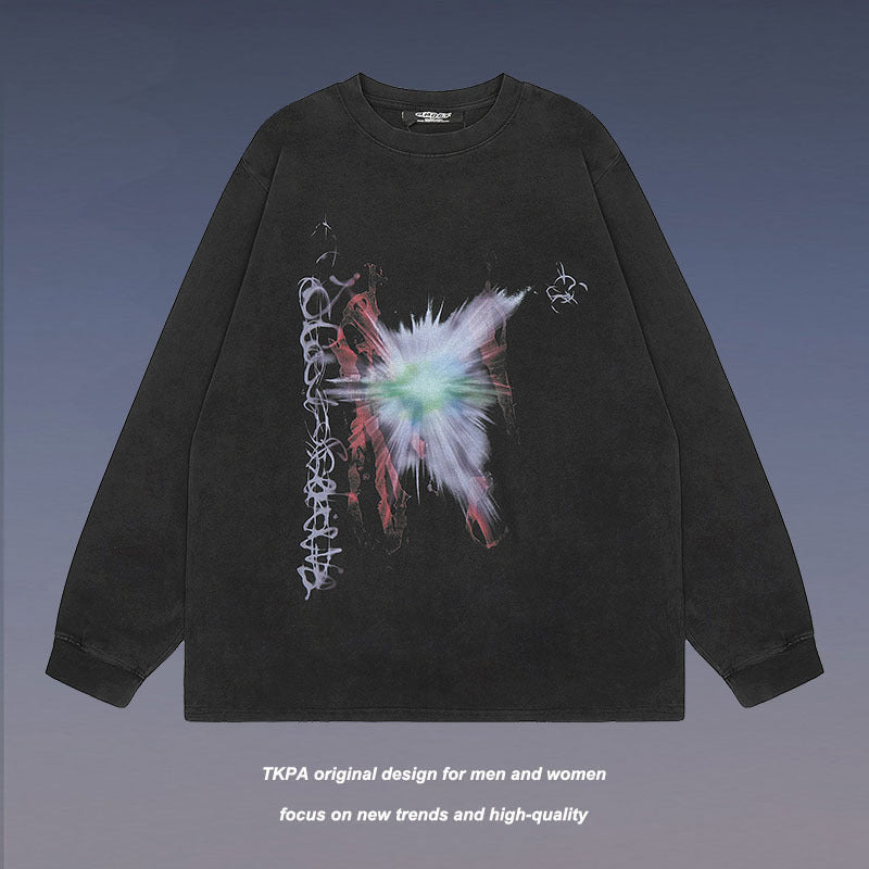 Men Long Sleeve Shirt Graffiti Printing Casual Couple Washed Long Sleeve T-shirt Men and Women
