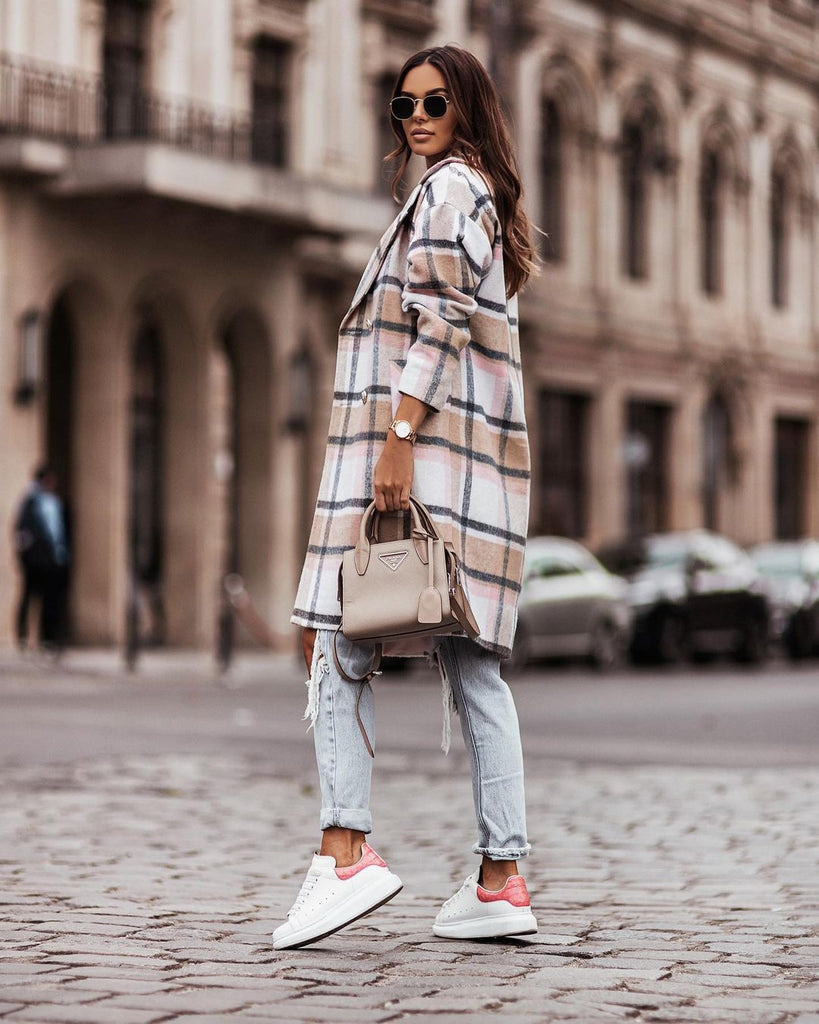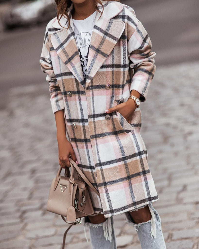 Plaid Trench Coat Winter Coat Women's Long Sleeve Checked Woolen Coat Casual